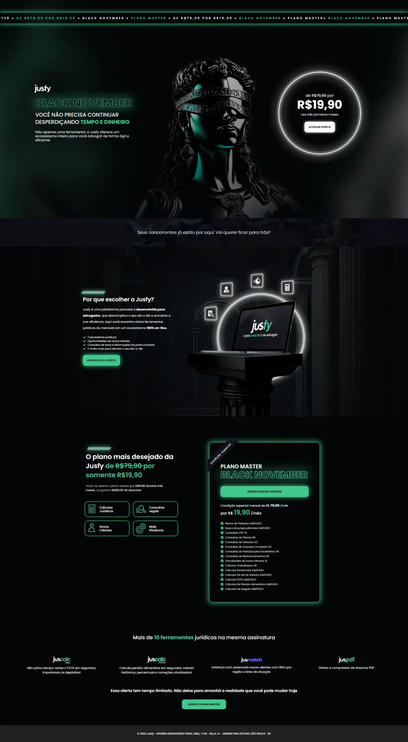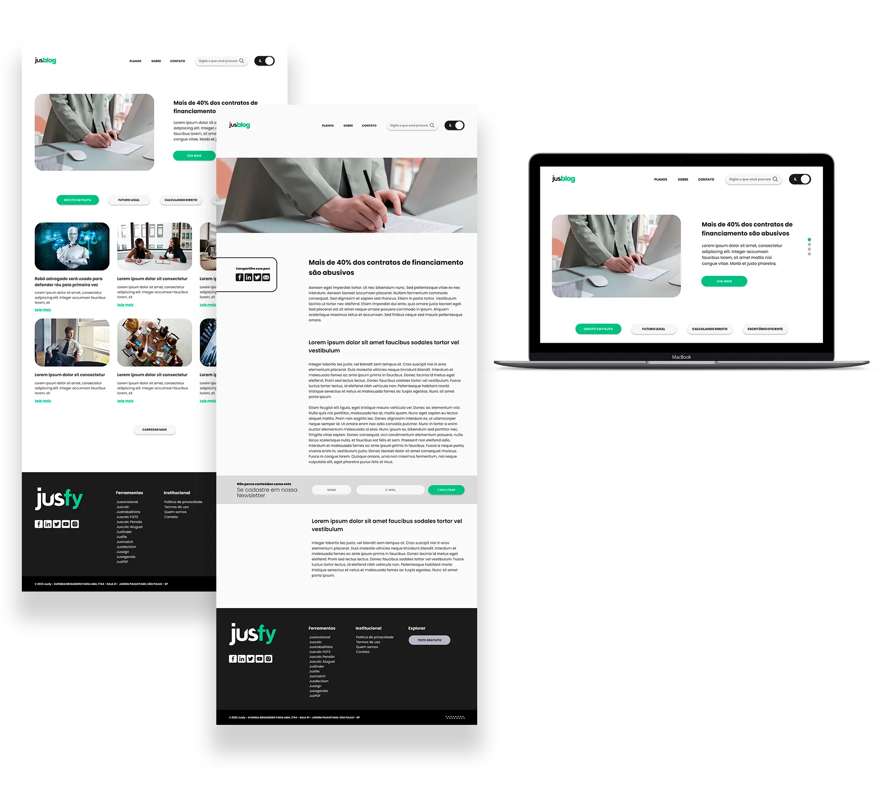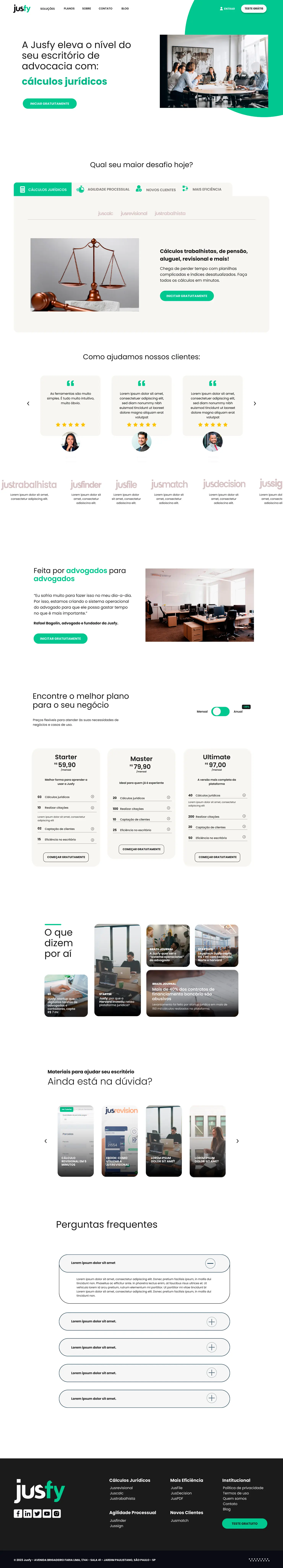 Jusfy é uma plataforma pensada e desenvolvida para advogados, que descomplica o dia a dia da prática juíridica. Neste projeto foi desenvolvida a identidade visual e diferentes aplicações da marca, como no site, landing pages e anúncios da empresa.